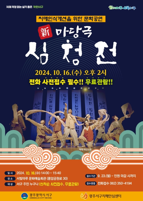 공연 관람료는 무료이며 사전접수 문의는 서구보건소 치매정책팀(350-4194)으로 전화 하면 된다.