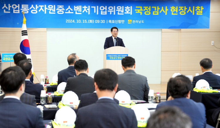 | 김영록 전라남도지사가 15일 목포신항 배후부지에서 열린 국회 산업통상자원중소벤처기업위원회 국정감사 현장시찰 설명회에서 인사말을 하고 있다. |