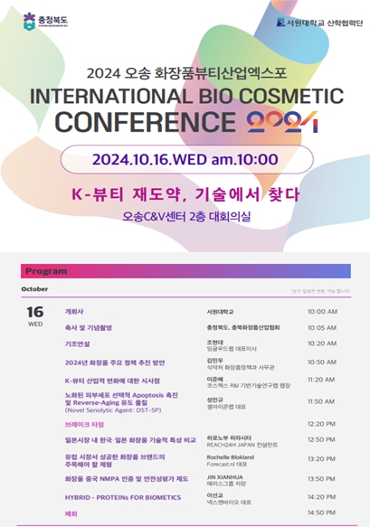 2024 오송화장품뷰티산업엑스포의 연계 행사로 개최되는 이번 컨퍼런스는 충청북도가 주최하고 서원대학교 산학협력단이 주관했으며, 국내·외 화장품 전문가를 초빙해 총 8개의 세션으로 진행됐다.