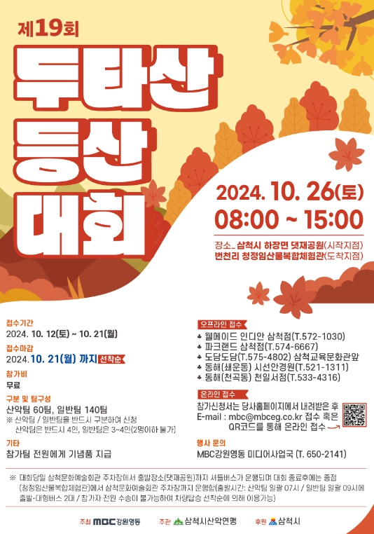제19회 두타산 등산대회는 삼척의 수려한 자연경관을 알리고 시민들의 건강증진 및 화합을 위한 행사로 오는 10월 26일(토) 오전 8시경 하장면 댓재공원에서 개최될 예정이다.
