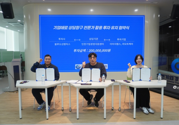 인천테크노파크(인천TP)에 따르면 16일 인천기업경영지원센터에서 엑셀러레이터(AC)인 ‘블루오션벤처스(대표 이준희)’와 스타트업 ‘주식회사 이미지랩스(대표 남은정)’, ‘주식회사 리모트케어(대표 김정호)’ 간의 투자유치 협약식이 개최됐다.