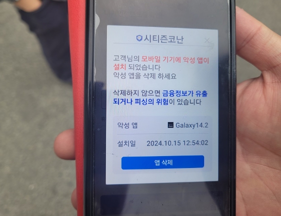 현장출동경찰관은 피해자의 휴대폰을 확인하던 중 면밀한 눈썰미로 가짜 “시티즌 코난(경찰청 개발 악성파일 탐지앱)” 이 설치되어있던 것을 발견했고, 해당 앱 제거 후 진짜 시티즌코난을 설치했다.