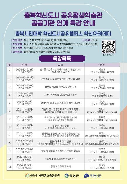박민순 평생학습과장은 “공공기관과 연계한 평생학습 활성화를 위해 혁신도시 이전 공공기관의 재직자를 특강의 강사로 초청해 이번 사업을 기획했다”며 “충북혁신도시 공유평생학습관을 중심으로 혁신도시 이전 공공기관과 연계한 다양한 사업들을 추진하겠다”고 밝혔다.