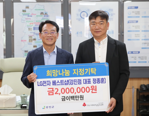 LG전자 베스트샵 강진점(대표 정종훈)은 매년 다양한 형태로 지역 사회에 기부를 실천하며, 2021년 430만 원 상당의 강진사랑상품권과 라면 150박스 기부, 2023년 전기 매트 20장(480만 원 상당)과 나눔 리더 가입, 그리고 2024년에는 군민장학금 300만 원을 지원한 바 있다.