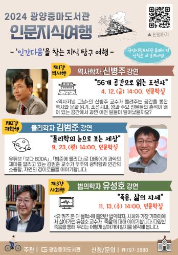 ‘인문지식여행’은 인간성 상실의 시대를 살아가는 현대인들을 위해 중마도서관이 마련한 2024년 인문학 사업이다.