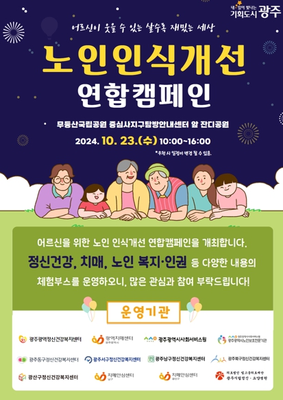 이날 캠페인은 광주시가 주최하고 광주광역정신건강복지센터, 광주광역치매센터, 광주광역시사회서비스원, 광주광역시노인보호전문기관이 주관한다. 또 5개 자치구 기초정신건강복지센터, 남구·광산구 치매안심센터, 광주시립정신병원 등 12개 기관이 참여한다.