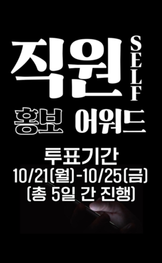 광주시는 100% 시민투표로 이뤄지는 만큼 시민들의 호응을 얻기위해 ‘셀프홍보어워드, 1위를 맞춰라’라는 시민 대상 이벤트도 함께 연다. 이벤트 기간은 10월 21일부터 24일까지 4일 간이다. 1등을 맞춘 50명의 응모자에게 1만원 상당 커피쿠폰을 경품으로 지급한다.
