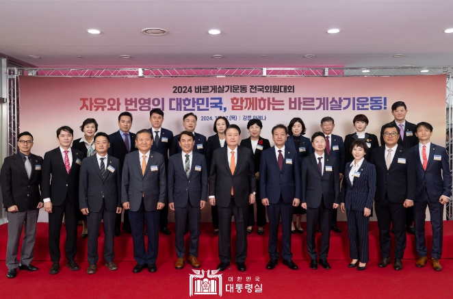 대통령은 또한 인구 위기를 비롯한 사회적 난제들에 더해 끊임없이 생산되는 가짜뉴스들이 자유민주주의를 위협하고 있다며 바르게 살기 운동의 3대 정신인 ‘진실’, ‘질서’, ‘화합’이 어느 때보다 중요하다고 강조했다.