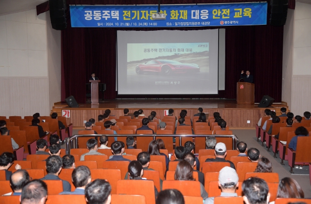 지하에 전기차 충전설비가 설치된 458개 공동주택 관리소장 및 안전관리자, 시·구 관련부서 공무원을 대상으로 한 이번 교육에는 최양주 광주소방본부 교수가 ▲전기자동차 화재 특성 ▲화재 예방법 ▲화재 발생 때 소방시설을 활용한 안전한 대응방법 ▲입주민의 피난 행동 요령 등을 교육했다.