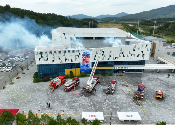 | 보성군, ‘2024년 재난대응 안전한국훈련’ 실시_다중 밀집 시설의 대형 화재 발생에 대비해 훈련 장소인 보성국민체육센터를 모의 진화하고 있다. |