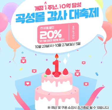 고객 성원에 보답하고자 곡성몰에서는 10월 23일부터 10월 27일까지 ‘개점 1주년, 매출 10억 달성 기념’ 곡성몰 감사 대축제 전 품목 20% 할인 행사를 진행한다. 또한 고객과 함께 곡성몰 1주년을 축하하고자‘삼행시 이벤트’를 통해 20명에게 단감 5kg을 증정한다.