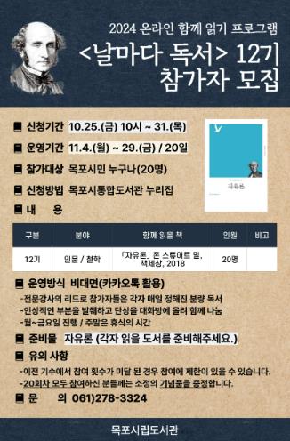 '날마다 독서' 12기는 오는 11월 4일부터 29일까지 개설되어 존 스튜어트 밀 '자유론'을 함께 읽을 예정이다.