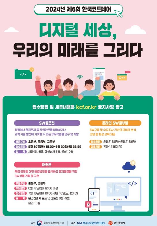 ‘디지털세상, 우리의 미래를 그리다’를 주제로 한 이번 대회는 초·중·고등학교 학생을 대상으로 소프트웨어 작품을 구현하는 ‘소프트웨어 공모전’과 제시된 문제를 소프트웨어로 해결하는 ‘해커톤’, 소프트웨어와 알고리즘을 학습하는 ‘온라인 소프트웨어 공부방’ 등 3개 프로그램으로 진행된다.