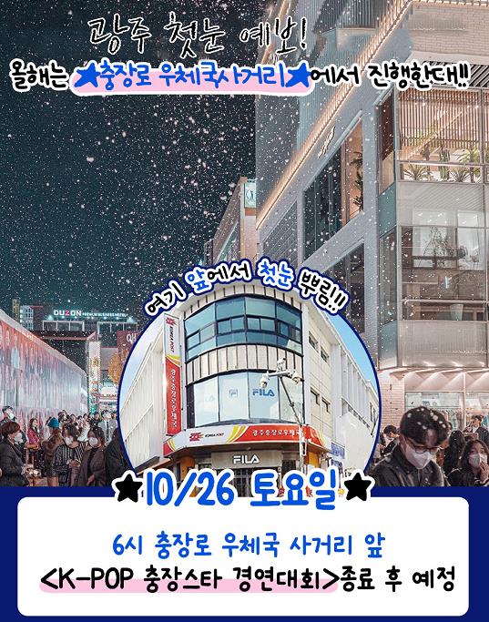 이날 메인 이벤트는 ‘첫 눈’으로, 충장로 우체국 사거리에 내리는 전국 최초의 첫눈을 선보일 예정이다.