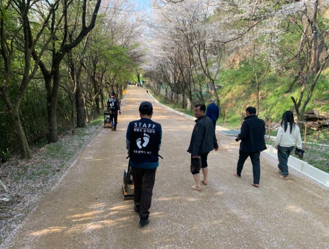 노인 일자리사업과 연계해 맨발 산책로 26곳에 인력 50명을 배치하고 이용 불편사항을 매일 점검하고 있으며 전담 유지관리자들을 별도 선발해 맨발길 주변 이물질 제거, 면고르기, 다지기 및 배수시설 정비, 세족장 청소, 주변 예초작업을 일상적으로 진행하고 있다.