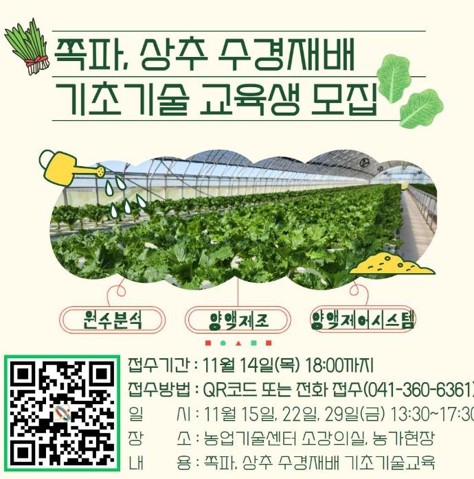 교육은 11월 15일부터 29일까지 매주 금요일 총 3회에 걸쳐 진행되며, ‘2025년 쪽파, 상추 수경재배 기반조성 시범사업’ 신청자 또는 교육 참석을 희망하면 누구나 QR코드 또는 전화로 신청할 수 있다.