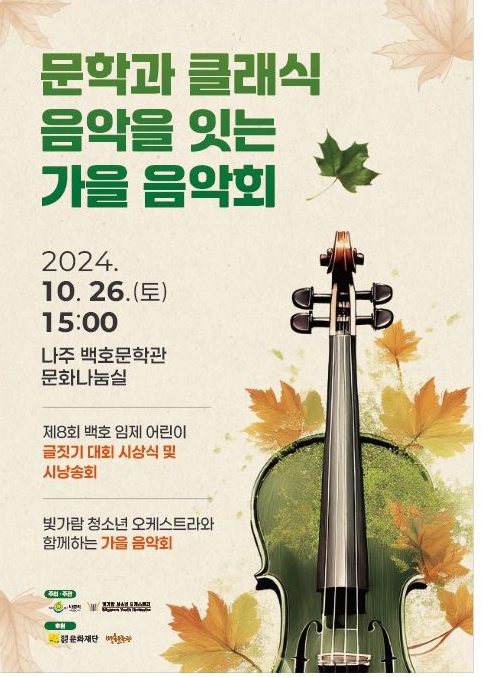 대회 수상자 중 김다은(경북성암초4), 김산(광주진제초5), 이서희(나주라온초5), 박서연(대전동화초2), 용만석(해남동초3), 박은혁(나주양산초3) 학생이 연주에 맞춰 작품을 낭송하고 빛가람청소년오케스트라 공연이 이어진다.