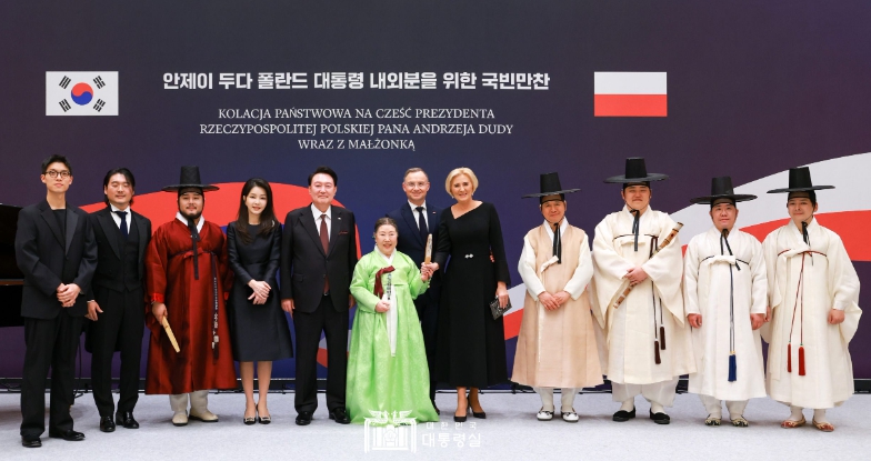 | 10월 24일 윤석열 대통령 부부는 청와대 영빈관에서 한국을 국빈 방문 중인 ?안제이 두다(Andrzej Duda)? 폴란드 대통령과 ?아가타 콘하우저-두다(Agata Kornhauser-Duda)? 영부인을 위한 국빈만찬을 함께 했다. |