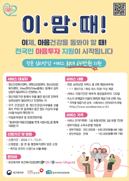 임진석 건강위생과장은 “이번 온라인 신청 도입으로 더 많은 시민이 심리상담 서비스를 이용해 보다 건강한 삶을 누릴 수 있기를 바란다”며 “아울러 서비스 제공 기관들의 적극적인 사업 참여도 당부한다”고 말했다.