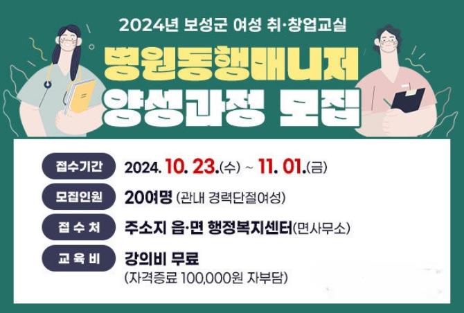 ‘병원 동행 매니저 양성 과정’은 11월 5일부터 12월 2일까지 매주 화요일과 목요일 오후 5시부터 8시까지 보성군 청소년문화의집 다목적실에서 진행된다.