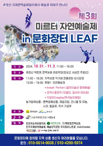 오는 31일부터 11월 3일까지 국제편백숲배움터 하모니센터(서삼면 추암로 555)에서 ‘제3회 미르터 자연예술제’가 열린다.