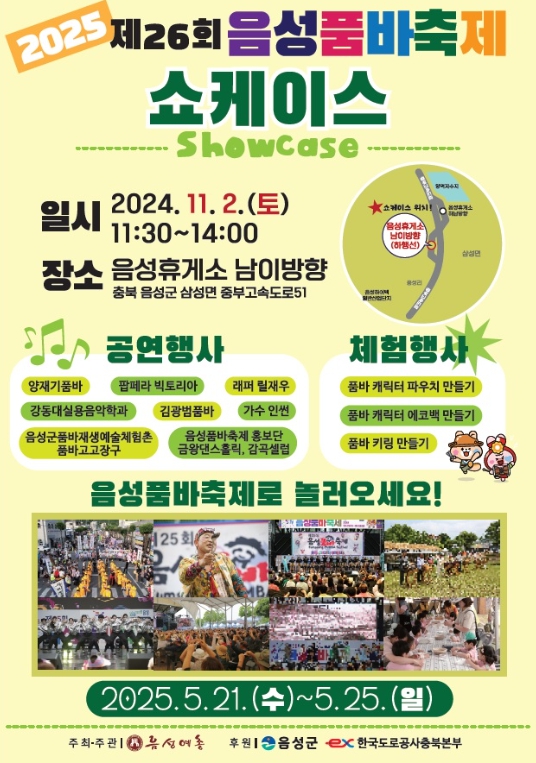 이날 쇼케이스에는 음성휴게소를 방문하는 방문객들에게 2025년 개최될 제26회 음성품바축제를 홍보하기 위해 품바캐릭터를 활용한 품바가방, 파우치, 키링 만들기 등 다양한 체험과 음성품바축제 퀴즈 룰렛 돌리기 이벤트를 준비했다.