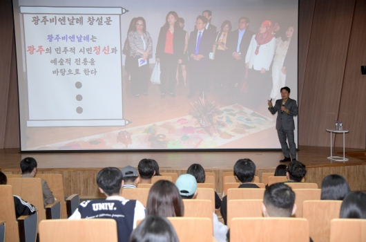 | 강기정 광주광역시장이 지난 28일 오후 전남대학교 공과대학 4호관 코스모스홀에서 시정 주요정책 및 계획에 대해 강연을 하고 있다. |