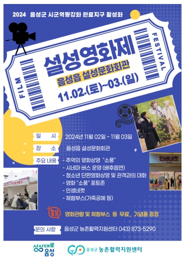 ‘설성영화제’는 11월 2일 오전 10시에 개막식을 시작으로 이틀간 오전 9시부터 오후 9시까지 설성시네마에서 추억의 영화 ‘소풍’과 최신영화 ‘아마존 활명수, 베놈3’를 무료로 상영하며, 청소년(음성고)들의 단편 제작 영화와 숏폼 공모 당선작도 상영된다.