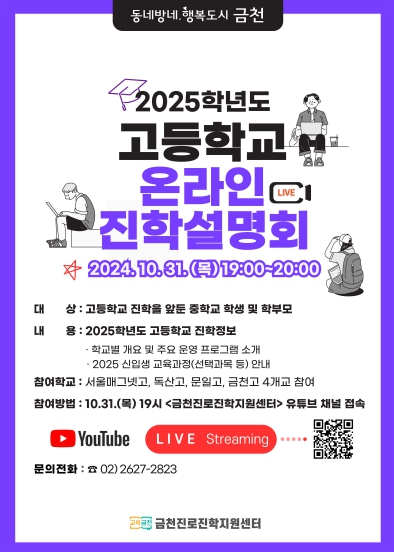 한편 금천진로진학지원센터 유튜브 채널에서는 이번 진학설명회뿐만 아니라 2025학년도 대비 수시 대비 논술특강, 면접특강 등 진로진학 관련 유익한 정보를 동영상으로 제공하고 있다.