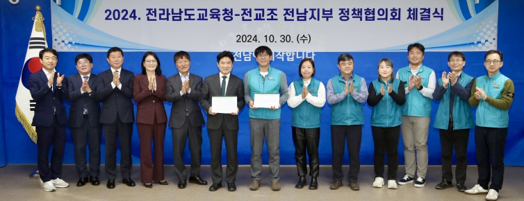 | 전남교육청과 전교조전남지부 관계자들이 2024.하반기 정책협의회 체결식을 마친 뒤 기념사진을 찍고 있다. |