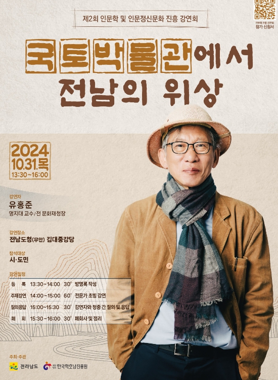 전남도는 31일 오후 2시 도청 김대중 강당에서 ‘국토박물관에서 전남의 위상’을 주제로 유홍준 명지대 교수를 초빙, 인문학 강연회를 개최한다.