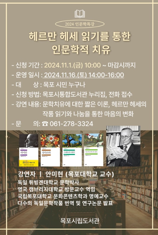도서관 관계자는 “목포 시민들이 문학작품과 함께 치유 받는 좋은 시간이 되길 바라며, 앞으로도 시민들을 위한 다양한 주제의 강연을 추진하겠다”고 말했다.