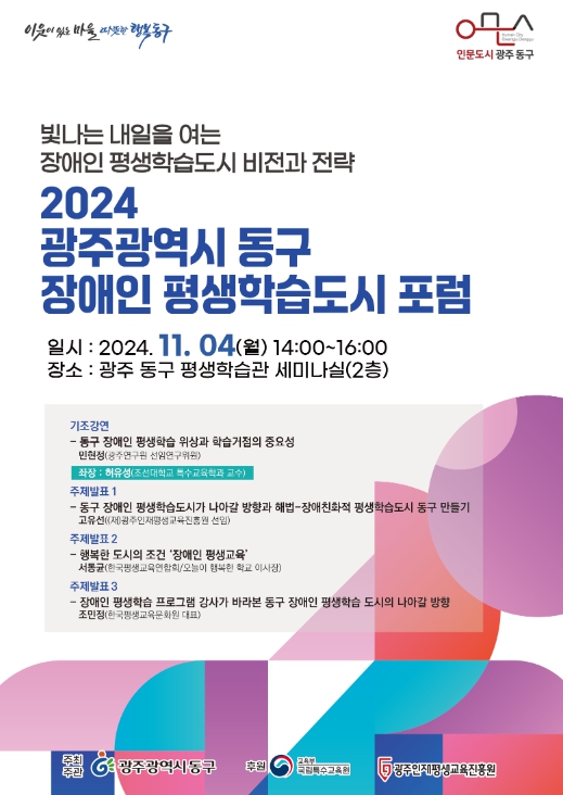 이날 포럼에서는 민현정 광주연구원 선임연구위원의 ‘동구 장애인 평생학습 위상과 학습거점의 중요성’을 주제로 한 기조강연과 고유선 (재)광주인재평생교육진흥원 선임의 ‘동구 장애인 평생학습도시가 나아갈 방향과 해법’, 서동균 한국평생교육연합회 오늘이 행복한 학교 이사장의 ‘행복한 도시의 조건 장애인 평생교육’, 조민정 한국평생교육문화원 대표의 ‘장애인 평생학습 프로그램 강사가 바라본 동구 장애인 평생학습도시의 나아갈 방향’ 등의 주제 발표가 펼쳐진다.