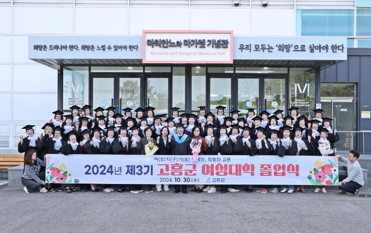 이번 졸업식에는 59명의 졸업생이 배출된 제3기 고흥군 여성대학이 지난 4월 개강하여 7개월간 격주 수요일마다 지역발전을 선도하는 유능한 여성 지도자 양성을 위해 ▲인문 ▲사회 ▲안전 ▲예술 등 다양한 분야에 걸쳐 14회의 수업이 진행되었다.