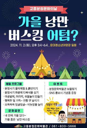 또한, 분청사기를 활용한 다육식물 화분 만들기와 전통 연날리기, 비눗방울 놀이 등 남녀노소 누구나 즐길 수 있는 9가지 무료 체험 행사가 마련되어 있으며, 관람객들은 깊어 가는 가을 감성과 캠핑의 낭만도 함께 느낄 수 있는 뜻깊은 시간이 될 것으로 기대된다.