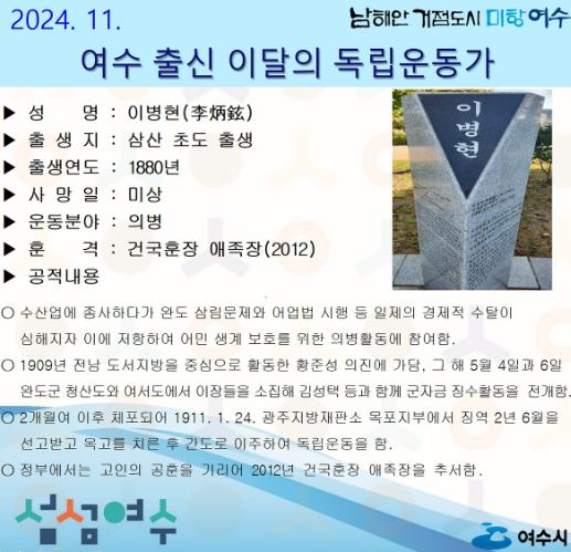 | 여수시, 11월의 독립운동가 초도 태생 ‘이병현 선생’ 선정 |