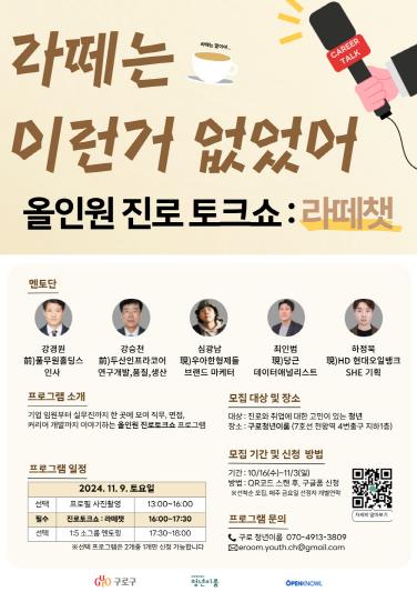 구 관계자는 “이번 프로그램을 통해 구로구 청년들이 취업과 진로 고민에 대한 실질적인 도움을 받고, 다양한 분야의 전문가와 소통하며 경력을 쌓는 데 있어 큰 힘이 되기를 기대한다”라고 전했다.