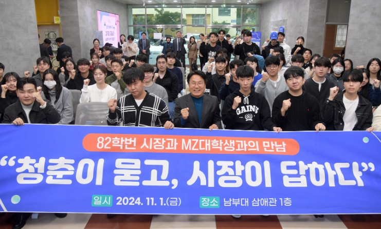 | 강기정 광주광역시장이 1일 오후 남부대학교 삼애관에서 학생들과 '청춘이 묻고 시장이 답하다'를 주제로 대화한 뒤에 기념촬영을 하고 있다. /광주광역시 제공 |