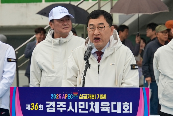 | 주낙영 시장이 경주시민체육대회에 참석해 인사말씀을 하고 있다. |