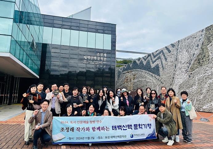 이번 연수는 벌교에서 소설 태백산맥을 사랑하는 이들이 자발적으로 운영하는 ‘태백산문 문학기행 추진단’이 함께했으며, 특히 오감만족 문학기행과 더불어 조정래 작가와의 만남까지 이어져 참여한 교원들에게 큰 감동과 호응을 얻었다.