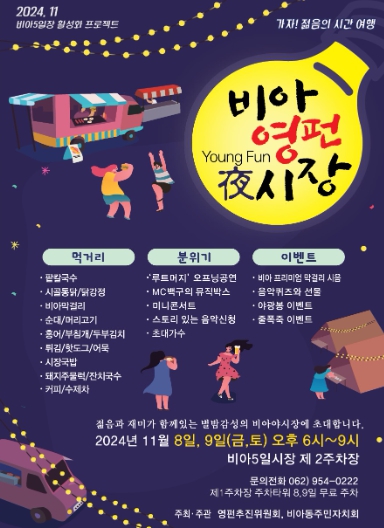 정무상 비아동 주민자치회장은 “주민과 기획한 비아야시장이 침체한 비아5일시장에 새로운 활력을 불어넣을 수 있는 기회가 될 것으로 기대한다”며 “젊은 에너지와 시장의 정감 넘치는 분위기가 어우러진 비아야시장에 많은 시민이 찾아주시길 바란다”고 말했다.
