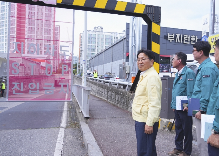 | 강기정 광주광역시장이 지난 6월21일 오후 북구 동림동 죽림지하차도를 찾아 여름철 호우 대비 지하차도 자동 차단시설 등 안전관리 실태를 점검하고 있다./광주광역시 제공 |