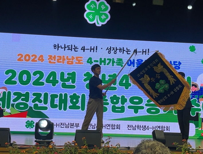 | 유홍렬 화순군4-H연합회장이 과제경진대회 우승기를 흔들고 있다. |