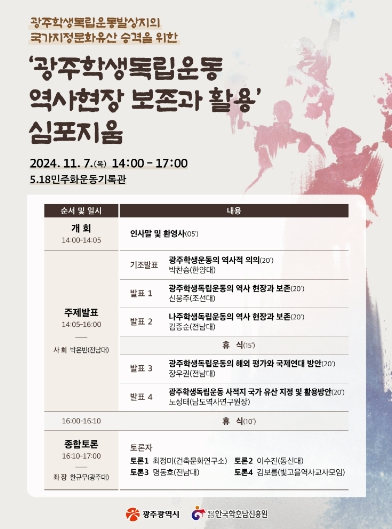 심포지엄에서는 학생독립운동의 역사적 의의와 가치(박찬승 한양대 교수), 광주학생독립운동의 역사현장과 보존(신웅주 조선대 교수), 나주학생독립운동의 역사현장과 보존(김종순 전 나주시 문화예술과장), 학생독립운동의 해외평가와 국제연대(장우권 전남대 교수), 학생독립운동의 국가지정유산 승격방안(노성태 남도역사연구원장) 등을 발표한다. 주제발표에 이어 한규무 광주대 교수를 좌장으로 종합토론이 진행된다.