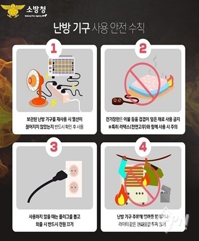 전기난방용품 화재 예방을 위해선 ▲KC인증마크 제품 사용 ▲전기장판 사용 전 전선 파열 여부 확인 ▲전기히터 주변 가연성 물건 제거 ▲외출 시 전원ㆍ플러그 제거 ▲장시간 사용하지 않기 ▲전기장판 보관 시 접는 행위 금지 등 안전 수칙을 준수해야 한다.