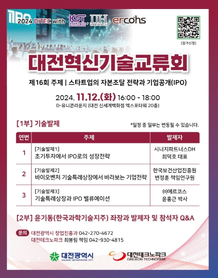 신청은 네이버폼또는 포스터 상단 QR코드로 가능하며, 자세한 문의는 대전테크노파크 기술사업화팀으로 하면 된다.