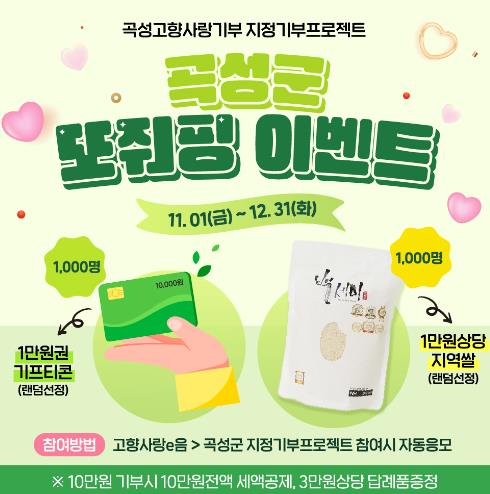 이벤트 참여 방법은 고향사랑e음 또는 전국농협에서 곡성군 고향사랑기부 후 자동 응모되며, 당첨자들에게는 개별 안내할 예정이다.