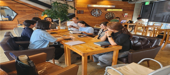 | 광주북구시설관리공단 이사장과 직원들이 짝꿍 독서토론을 즐기고 있다. |