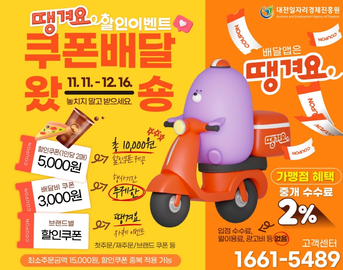 11월 11일부터 12월 16일까지(예산소진시 조기종료)‘땡겨요’를 통해 15,000원 이상 구매시 할인쿠폰을 최대 10,000원, 기간 내 상시 활용 가능한 배달비 할인쿠폰 3,000원을 무제한 제공한다.