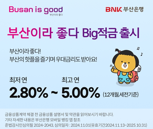 '부산이라 좋다 빅(Big)적금'은 부산을 사랑하는 '큰(Big)' 마음과 위치인증 임무(미션) 수행이라는 '큰(Big)' 재미를 담은 적금으로, 시 도시브랜드 '부산이라 좋다(Busan is good)'를 반영해 부산의 여행과 일상을 기록하는 테마형 적금이다.